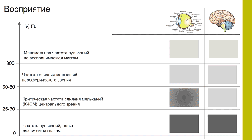 Широко распространено мнение, что человеческий глаз чувствует пульсацию освещения частота которой не превышает нескольких десятков Герц. На этом допущении построено воспроизведение видеоизображений в кино и телевидении – там частота смены кадров составляет 25 Гц, 50Гц и более, что воспринимается глазом человека как целостное во времени, плавно изменяющееся изображение. Дело в том, что мозг человека перестает успевать полноценно обрабатывать ту часть поступающей ему от органов зрения информации, которая изменяется с частотой выше нескольких десятков Герц.