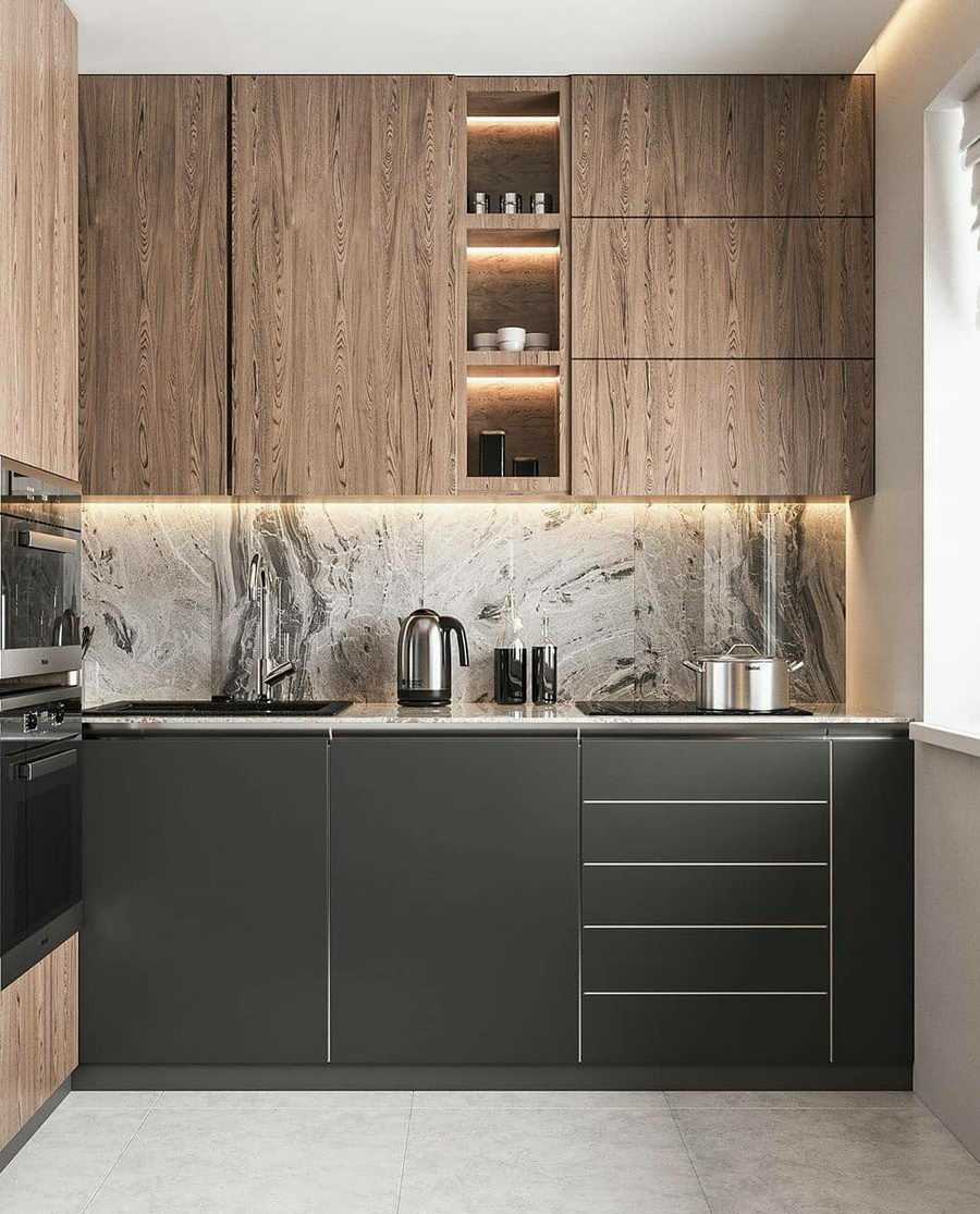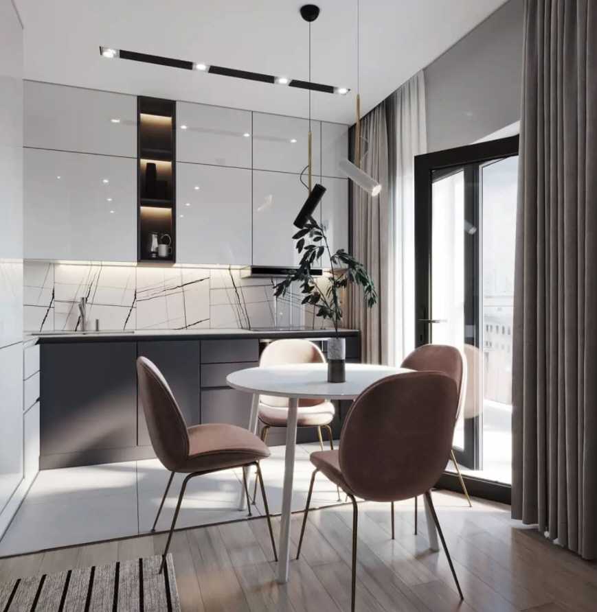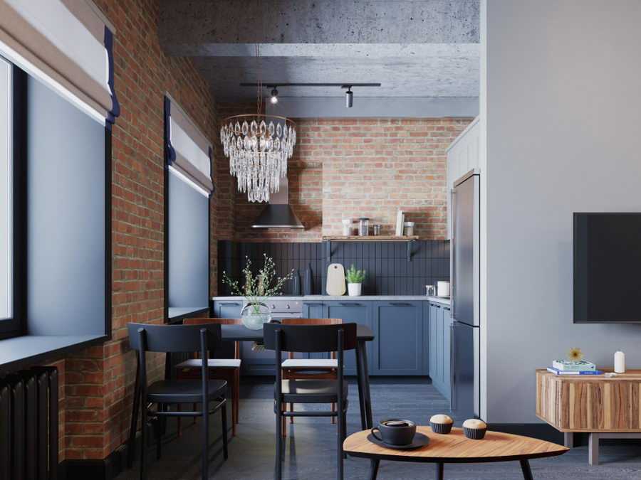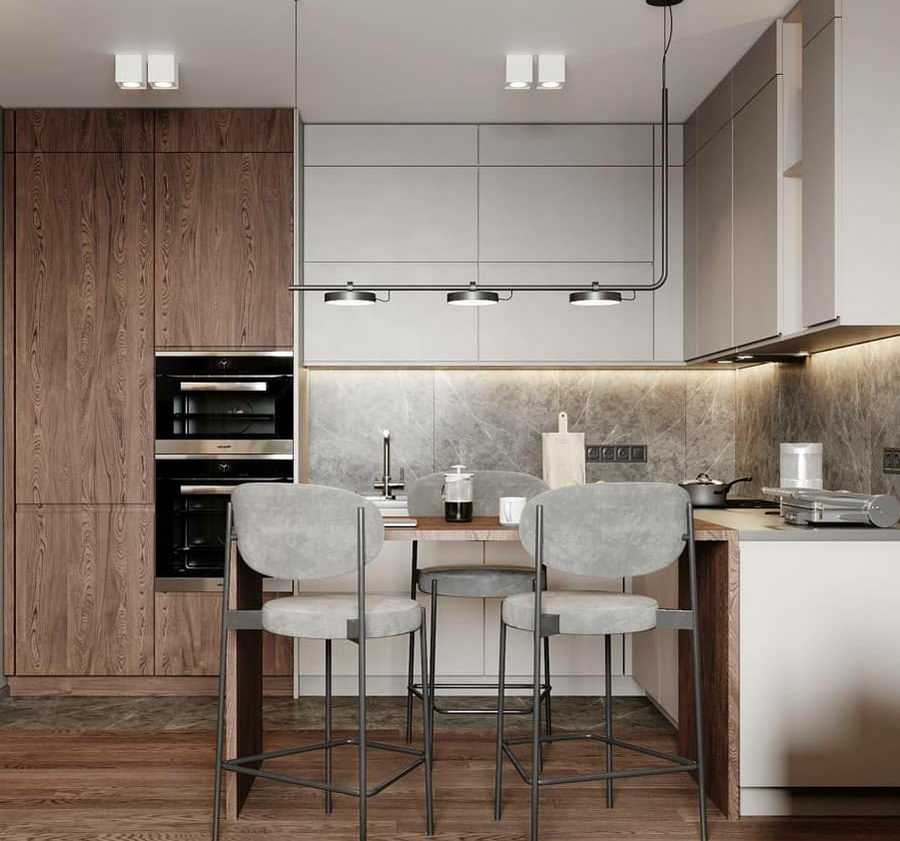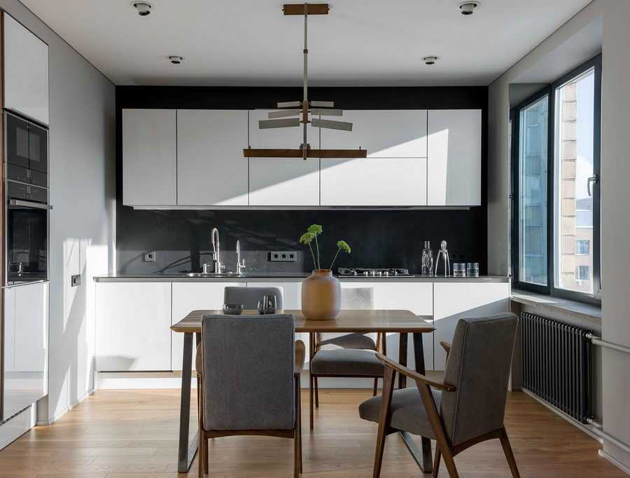 Если кухня узкая, маленькая, то в ней важно детально продумать освещение. Свет, падающий с потолка на длинную стену, визуально сделает потолки выше, а на короткую стену – длиннее комнату