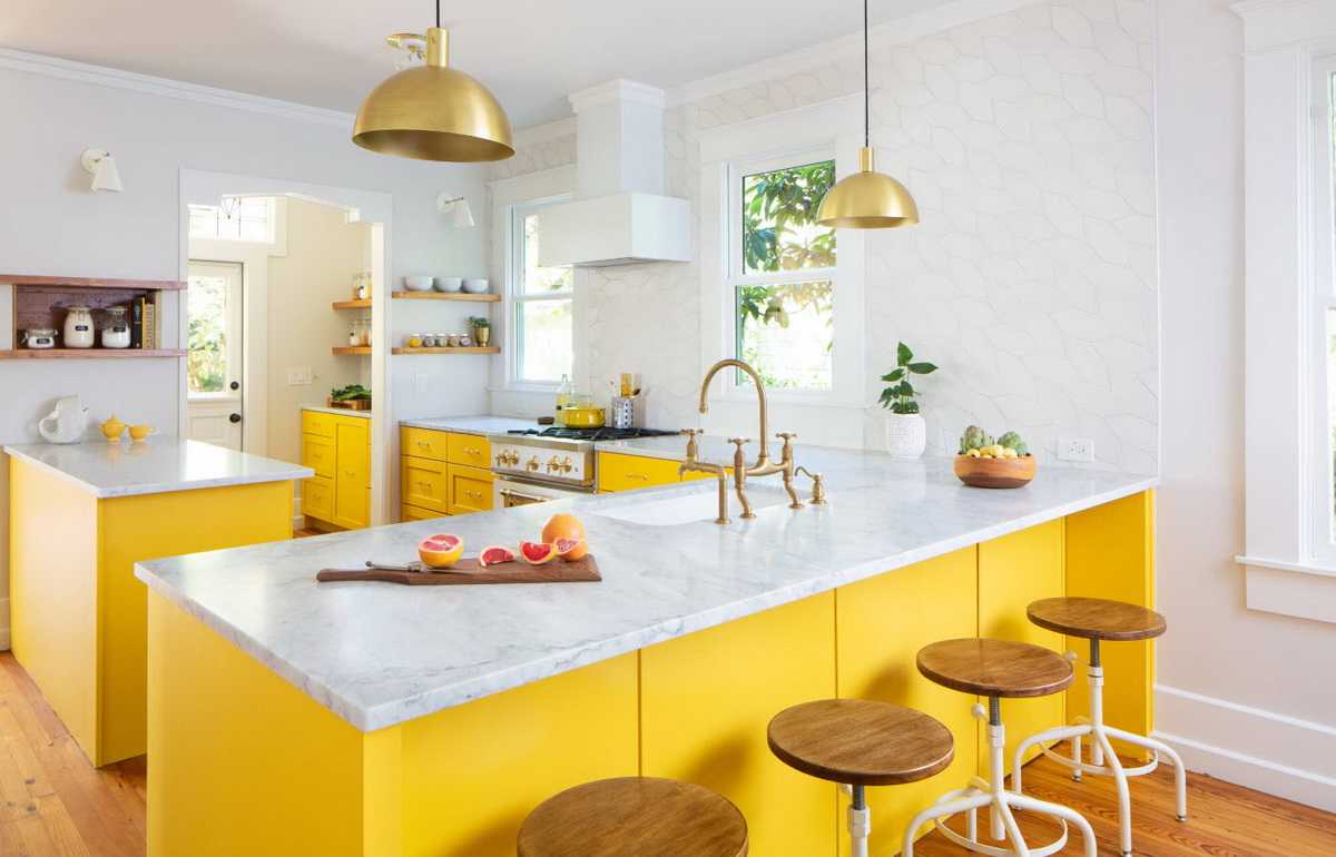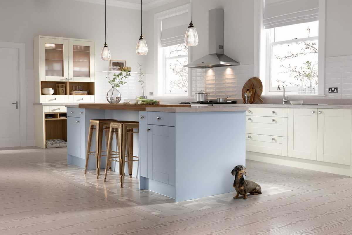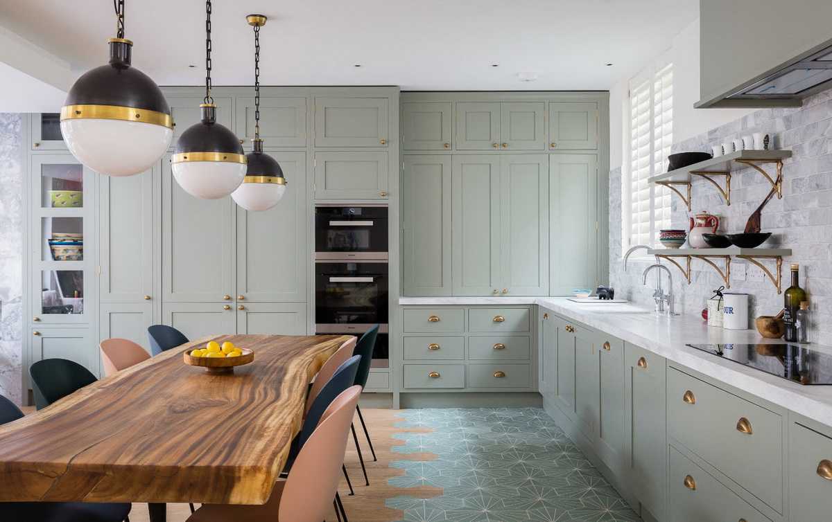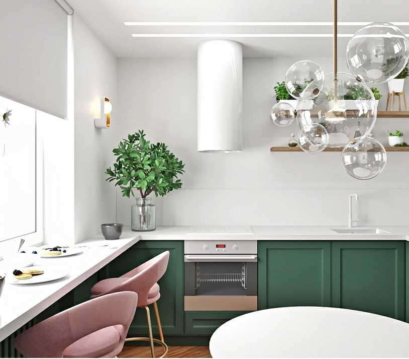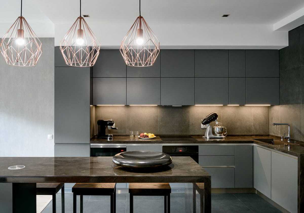 При выборе светового спектра важно учитывать цвет кухни для дополнения интерьера. Светильник, низко подвешенный над обеденным столом, будет выделять зону, а если его подвесить выше, то свет распространится на всё помещение