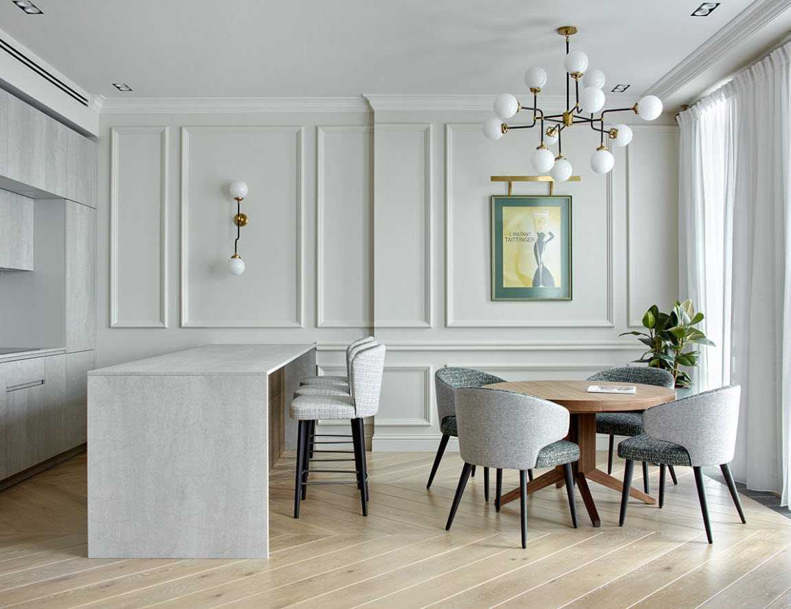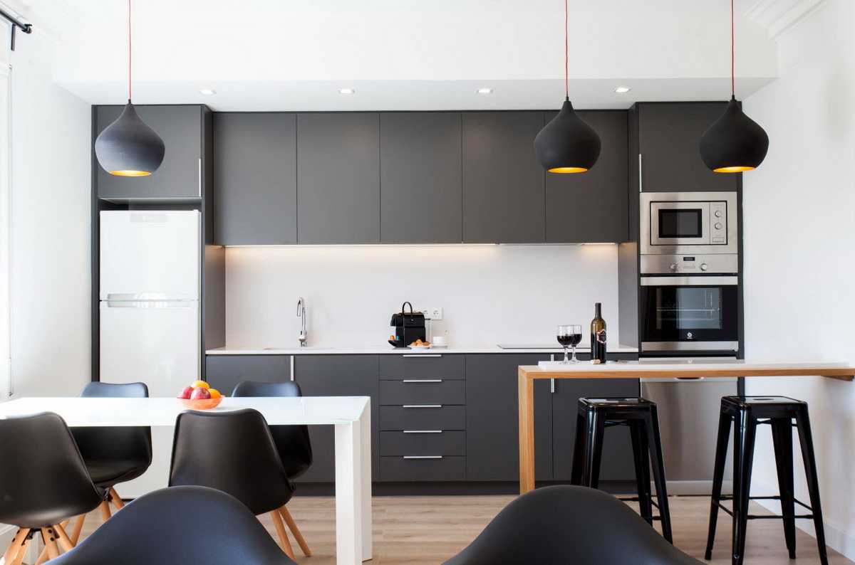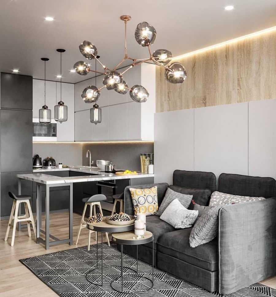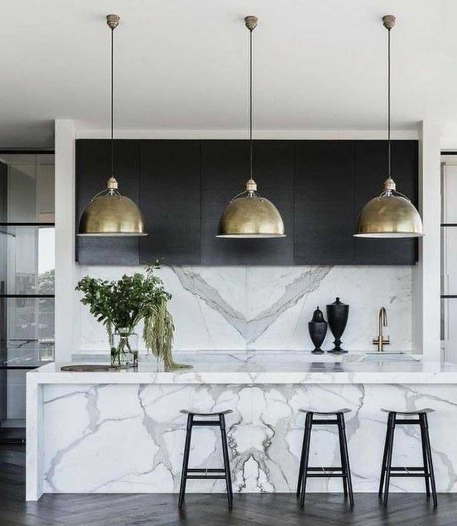 Для овальных и прямоугольных столов, барных стоек одну люстру лучше заменить несколькими подвесными. Световой поток станет более равномерным.