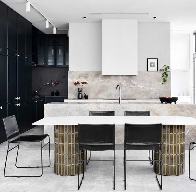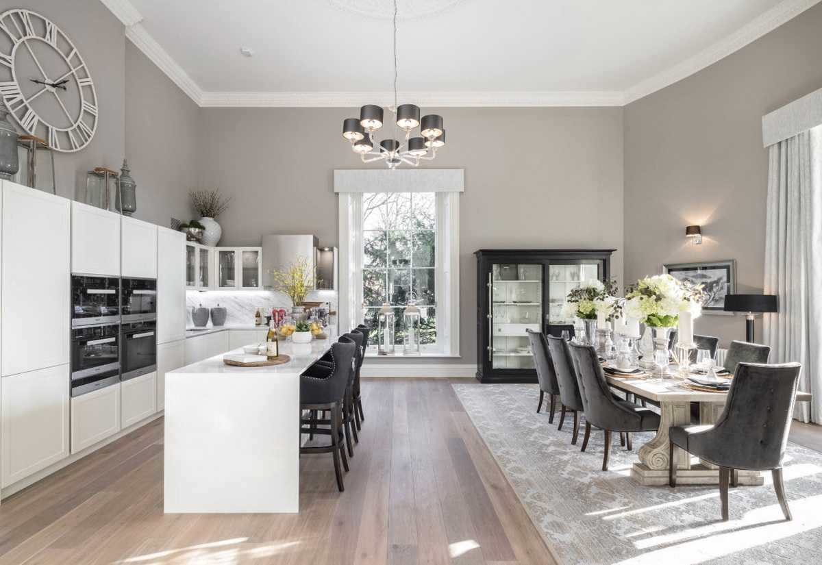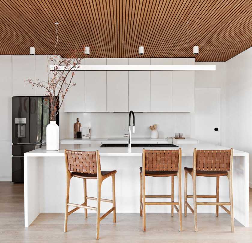 Подсветку обеденной зоны в большой кухне можно сделать на разных уровнях в подвесном гипсокартонном потолке. Таким образом, создается дополнительное зонирование помещения.