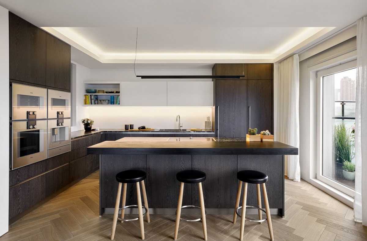 - Светодиодная подсветка способна реализовать любое дизайнерское решение. Ее можно расположить за потолочным карнизом, под полупрозрачным полотном натяжного потолка или стеклянными панелями, выступающими в роли кухонного фартука. Если выполнить отделку стен и пола в темных тонах, то создастся футуристская иллюзия космического пространства. Подсвеченные детали кухонного интерьера будут светиться, словно звезды или планеты на ночном небосклоне.